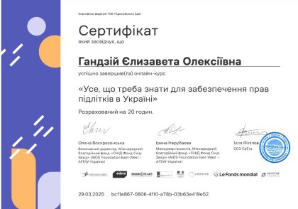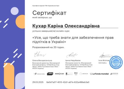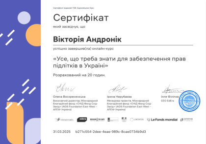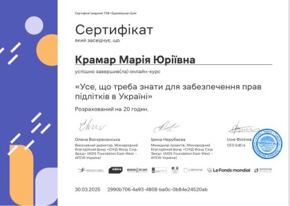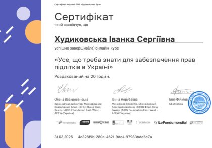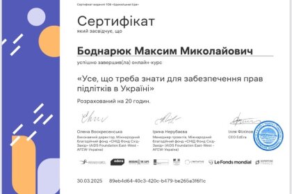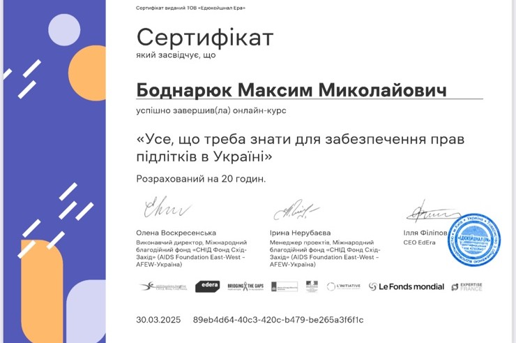 Студенти Чернівецького навчально-наукового юридичного інституту, під керівництвом доцента кафедри конституційного, адміністративного та фінансового права Івана Володимировича Глиняного, успішно завершили онлайн-курс «Усе, що треба знати для забезпечення прав підлітків в Україні» (https://study.ed-era.com/ar/courses/course/5137)